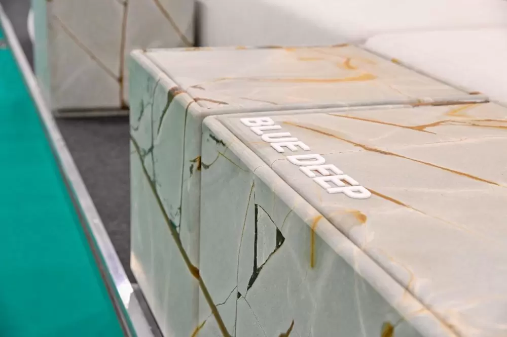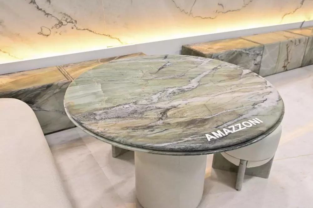 This year, we introduced to the international market a carefully curated concept, expressed through a clean and minimalist design inspired by the Pantone Color of the Year 2026. Our booth highlighted the elegance and sophistication of the materials Amazzoni, Crystal White, Blue Deep, and Chantilly.
